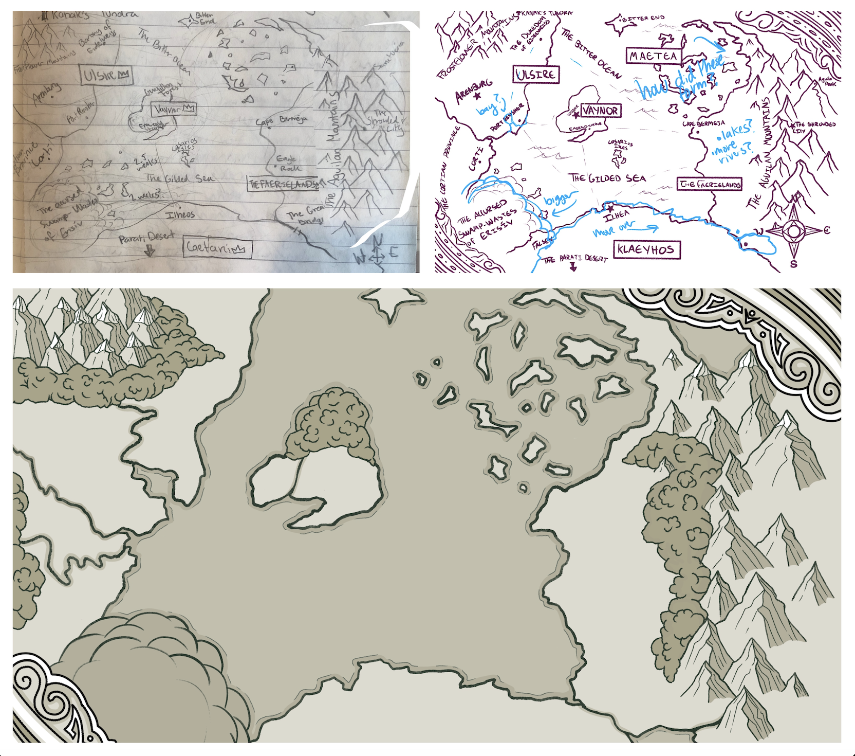 When designing a world, everything is a question. Most my processes begin with a “huh, how would that look?” moment. I work best when free to backtrack, connect, and re-find my ideas — nothing is sacred or above amendment. I enjoy basing my designs on historically inspired precedents, such as in cartographic fashion styles.