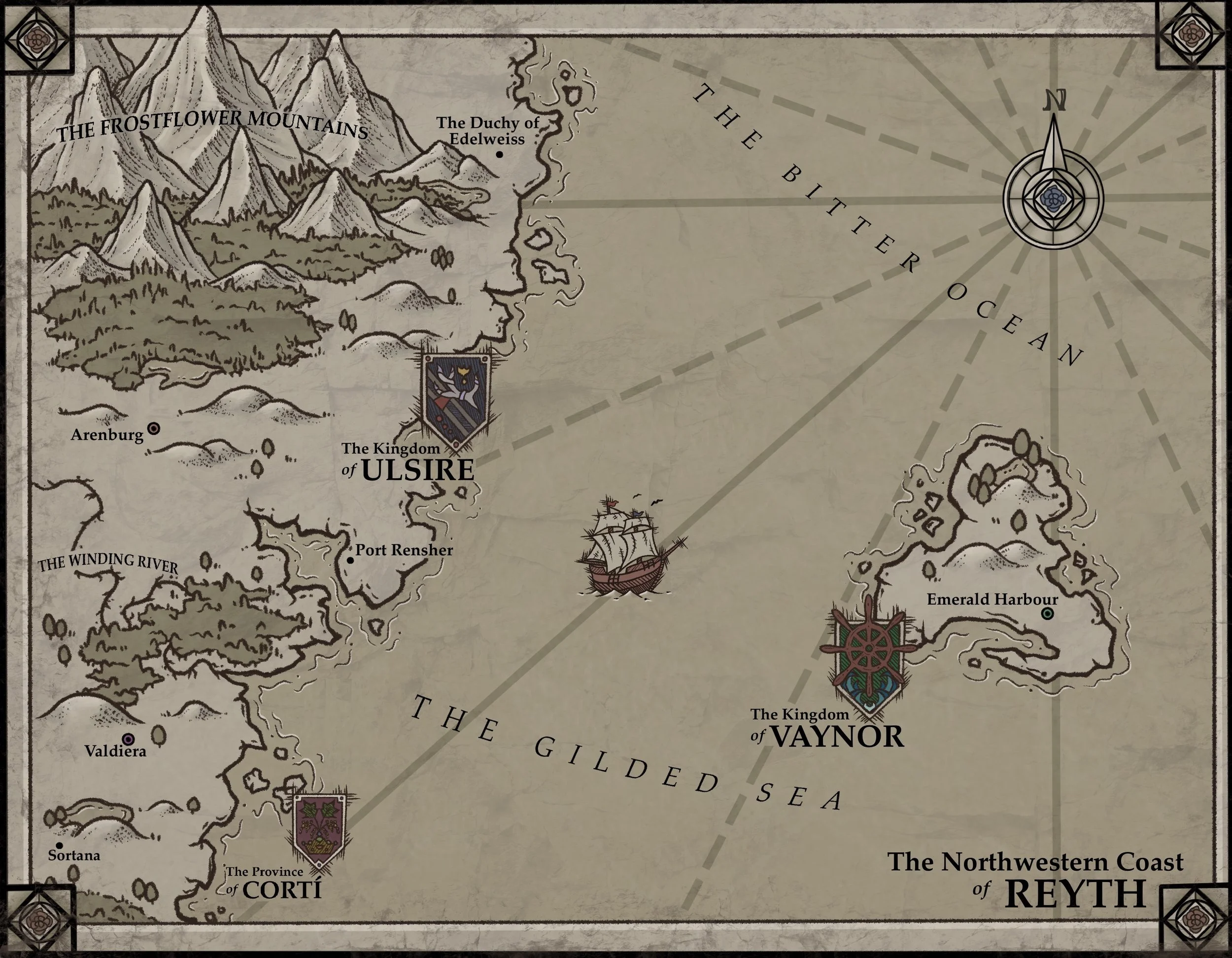 …welcome to the lands of Reyth. The heart of the kingdoms is known as the Gilded Coast: a crossroads of powerful nations, trade empires, opportunistic smugglers, and the last whispers of old magic. This worldbuilding project has grown exponentially — and seen me grow a good deal in turn — since I embarked upon it over five years ago. Enjoy glimpses into my creative process as I explore the Gilded Coast and some of the creatures that call it home.