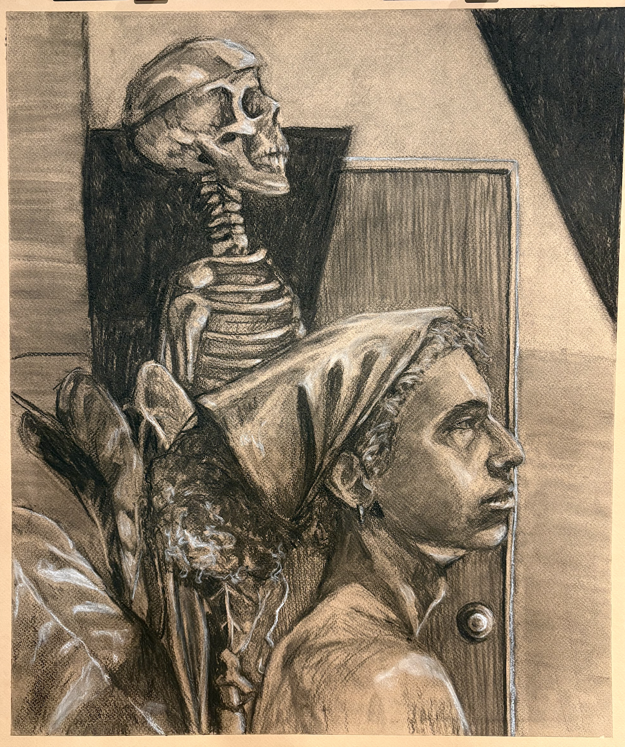 Looking Forward. 2025, charcoal and conte crayon on brown paper, 22 x 30''.